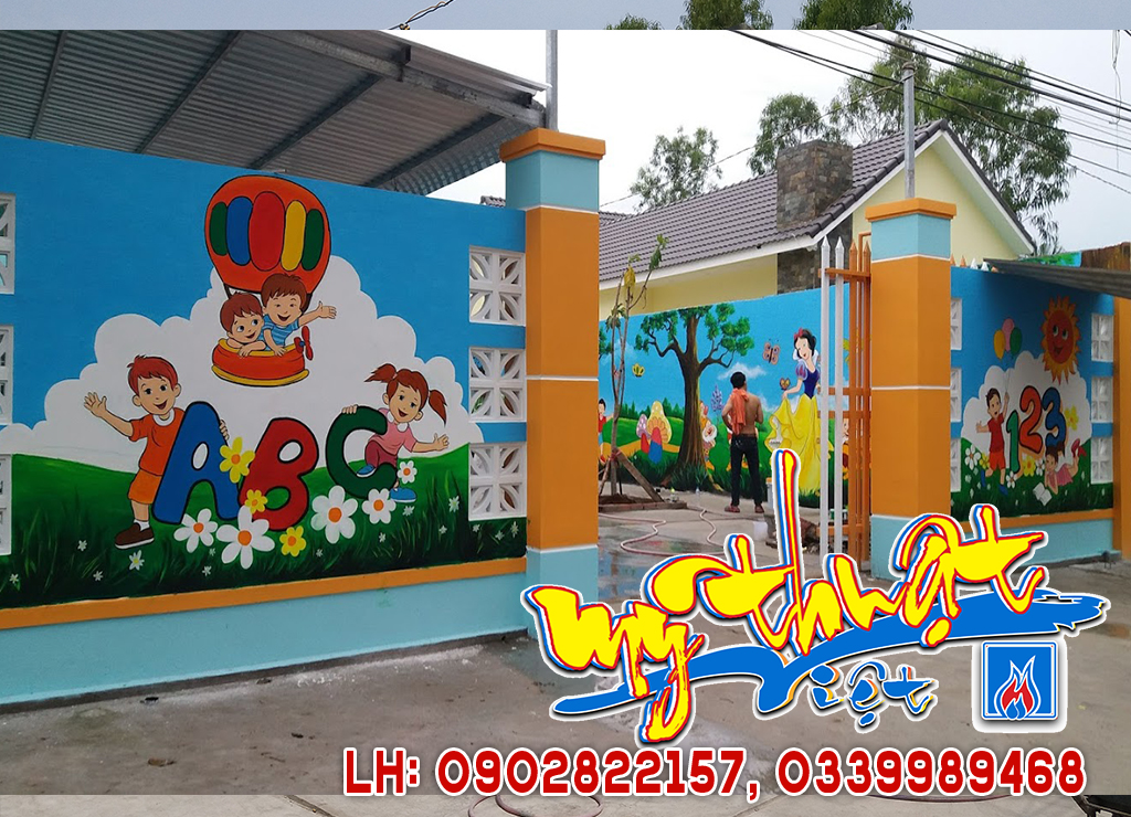 Vẽ tranh tường mầm non đẹp, sân trước của trường. kết hợp sân chơi cho Bé...