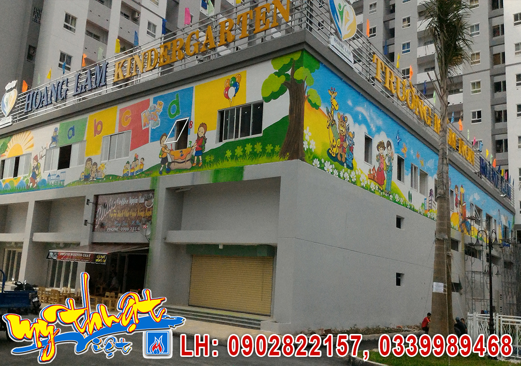 Vẽ tranh tường trường Mầm Non Hoàng Lam Bình Chánh. Những bức tranh tường được thiết kế theo chủ đề phù hợp với từng độ tuổi: thế giới động vật, thiên nhiên, truyện cổ tích, chữ cái – con số, kỹ năng sống, an toàn giao thông, bảo vệ môi trường… Màu sắc tươi sáng, hình ảnh thân thiện, bố cục rõ ràng giúp trẻ dễ quan sát, ghi nhớ và học hỏi một cách tự nhiên.